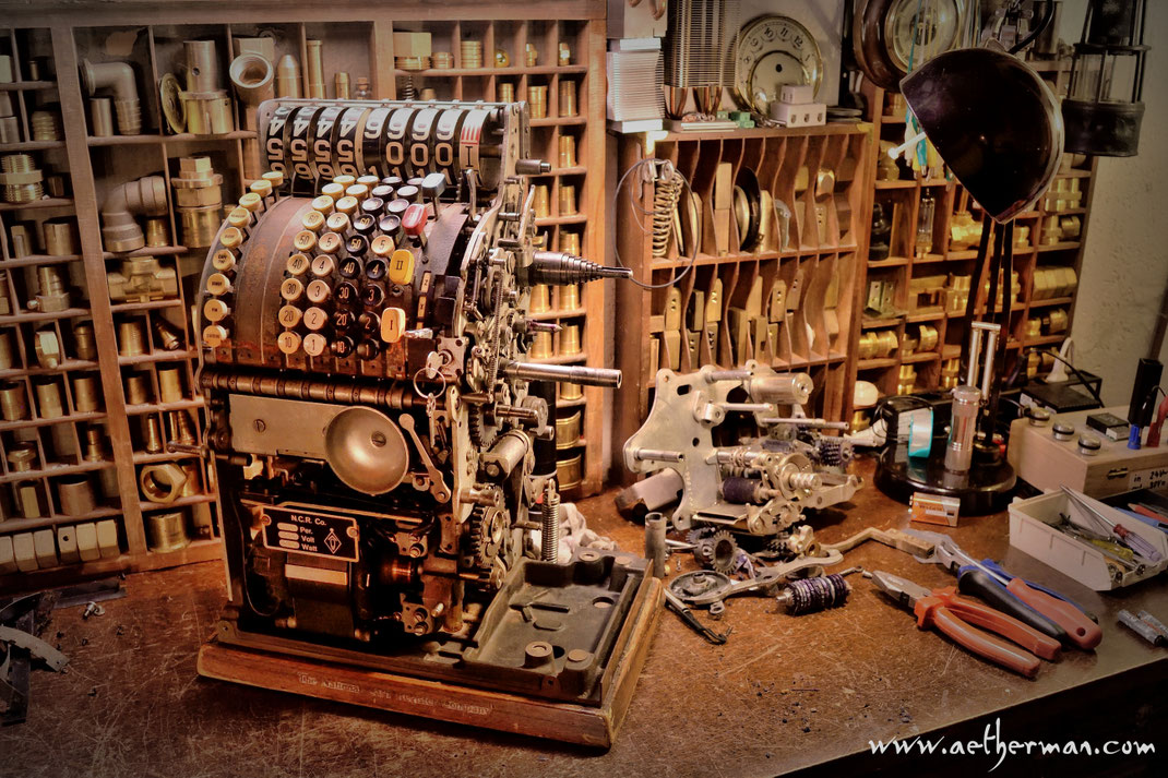 Diese bleischwere NCR Kasse aus den 50er Jahren steht bei mir schon seit mehr als einem Jahrzehnt rum. Die NACIONAL CASH REGISTER CLASS 52 stand damals in vielen Läden und funktionierte elektro-mechanisch. Leider ist die Mechanik komplett blockiert und hat sich bis jetzt jedem Reparaturversuch widersetzt. Also habe ich mich entschieden das Ding entsprechend umzubauen... mal sehen was daraus wird...