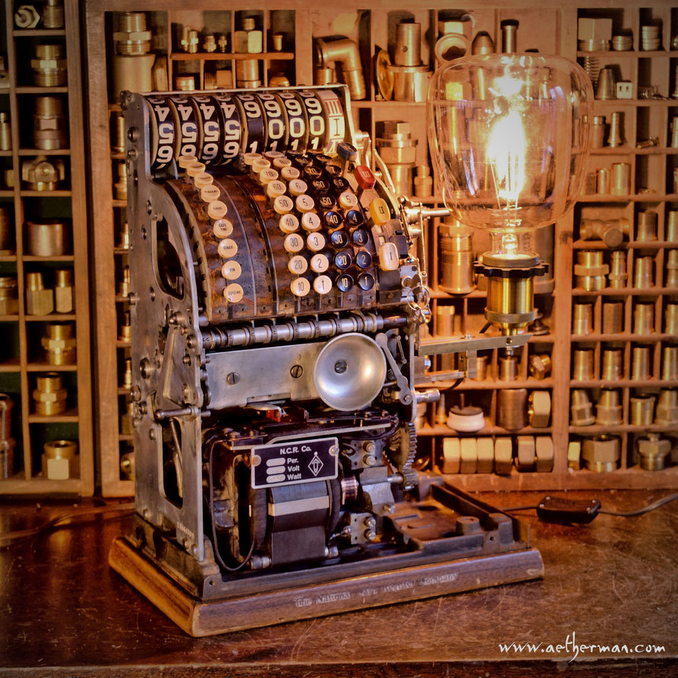 Die NCR CLASS 52 wurde in den 50er Jahren gebaut und war eine elektro-mechanische Konstruktion. Sie verfügte zwar über einen Elektromotor anstelle der früher verwendeten Handkurbeln, trotzdem passierte die gesamte Rechenoperation mechanisch über viele Zahnräder, Federn und Hebel. Das selbe galt für den Drucker.