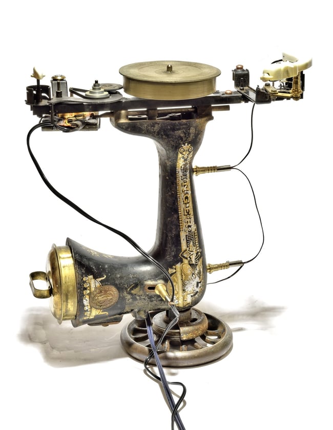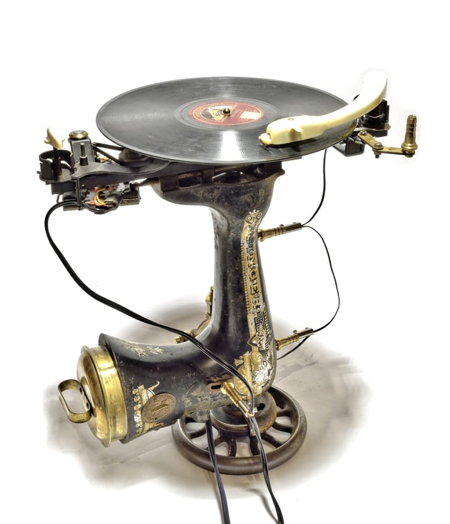 Dieser aussergewöhnliche Plattenspieler basiert auf einer alten SINGER SPHINX Nähmaschine aus dem Jahr 1903. Ich habe diese Maschine vor Jahren einmal für einen Franken ersteigert. Der Zustand war absolut faszinierend - nach rund einem halben Jahrhundert in einem feuchten Kuhstall.