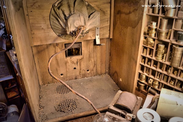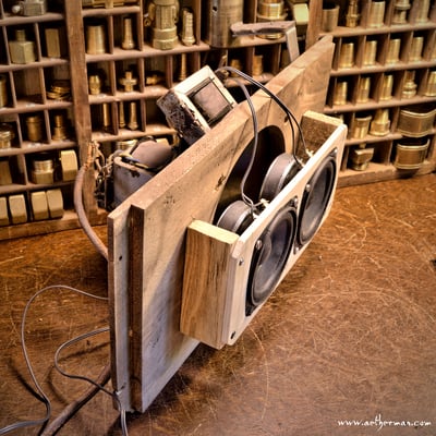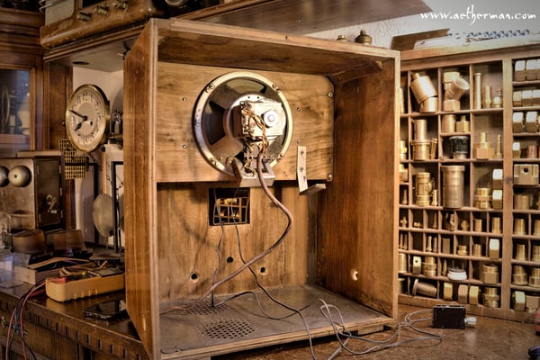 Der Lautsprecher wurde mit seiner Montageplatte um einige Zentimeter zurückversetzt, damit zwei neue HIFI-Lautsprecher ihren Platz fanden. Das Zurücksetzen fällt optisch kaum auf. Der EIN/AUS-Schalter wirde überbrückt und für den neuen kleinen Bluetooth-Verstärker verwendet. Das Radio kann also wie früher über den Originalknopf ein- uns ausgeschaltet werden. Der neue Verstärker fand seinen Platz zwischen der alten Elektronik im Chassis. Um den Look zu erhalten wurden die alten Glühbirnchen der Anzeige frisch verdrahtet und leuchten nun in grün, weiss und rot.