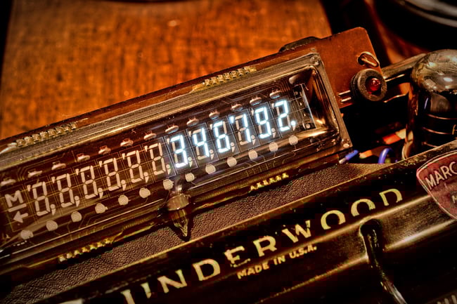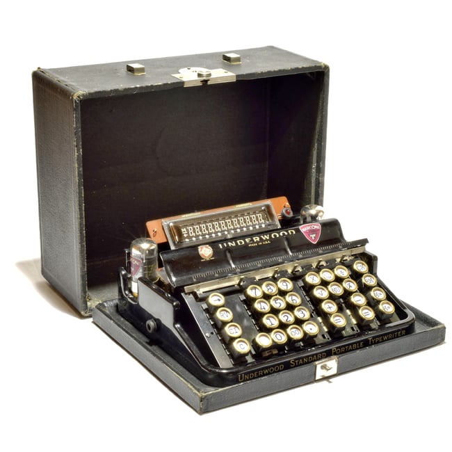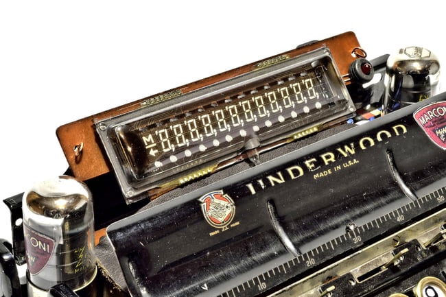 Exklusiver Tischrechner, aufgebaut aus einer antiken UNDERWOOD Portable Schreibmaschine aus dem Jahre 1926 und einem CANON Canola L1217 aus dem jahre 1976.