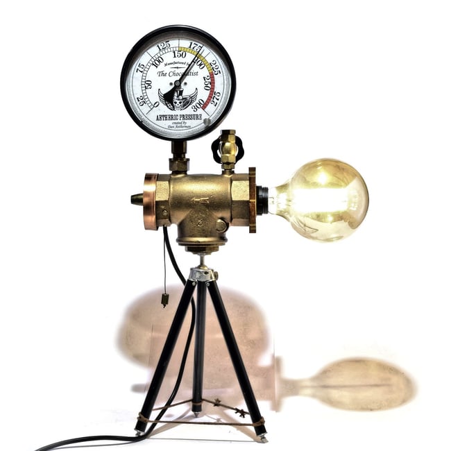 Lampe mit grosser Globe-Glühbirne auf der Basis eines Wasserventils